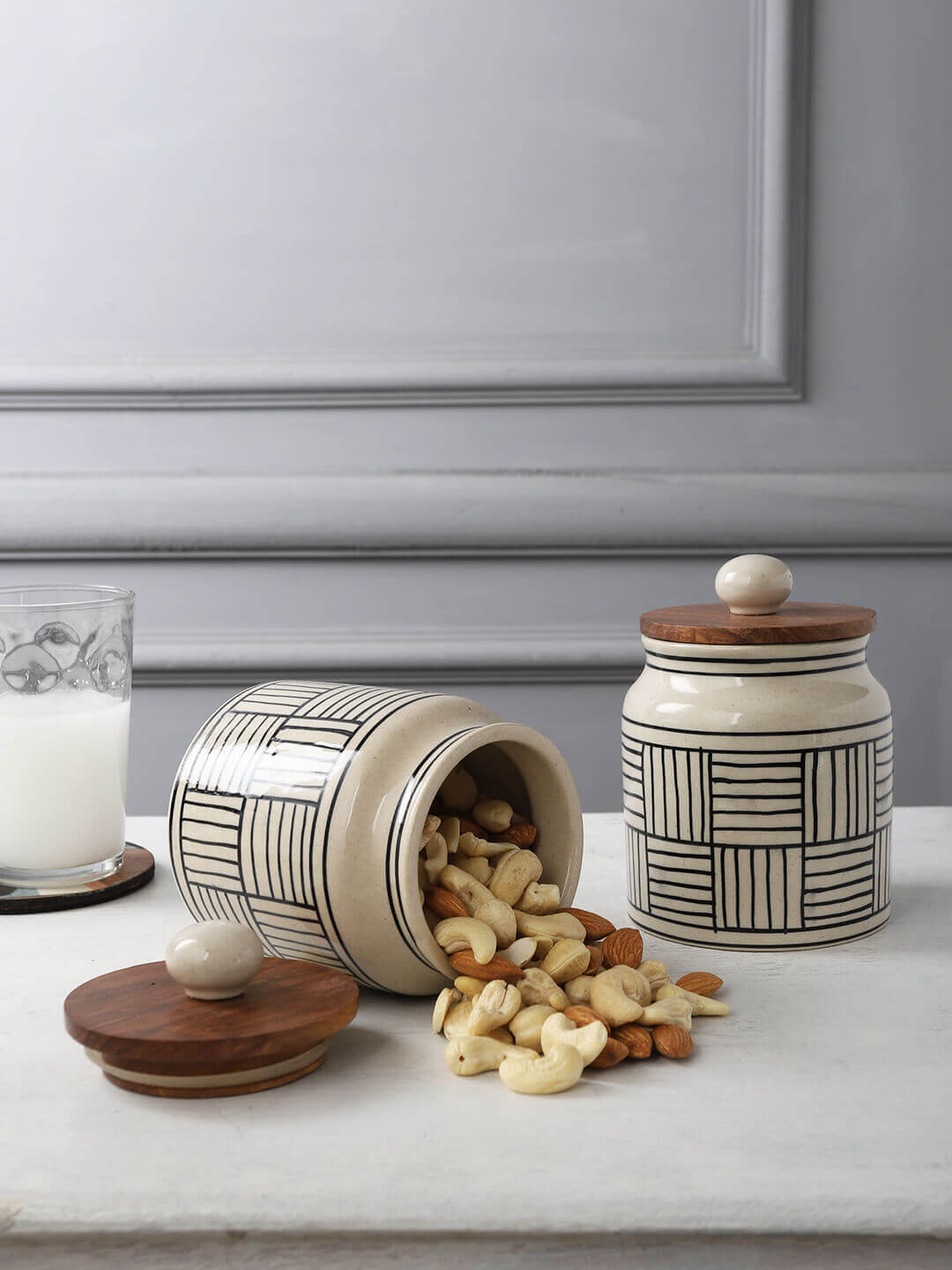 Set of 2 hand-painted jars (460ml each) with airtight lids. Store spices, dry fruits, snacks, masalas. Adds handcrafted elegance to your kitchen.